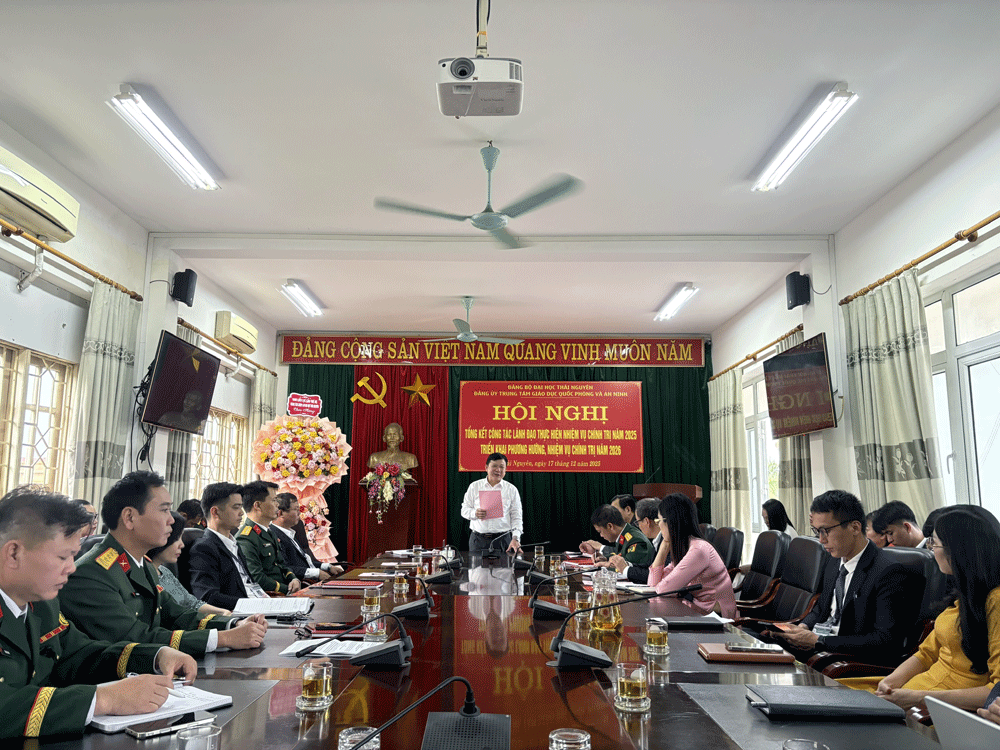 17/12/2025Chiều ngày 17/12, Trung tâm Giáo dục quốc phòng và an ninh Đại học Thái Nguyên đã long trọng tổ chức Hội nghị Tổng kết công tác lãnh đạo thực hiện nhiệm vụ chính trị năm 2025 và triển khai phương hướng, nhiệm vụ chính trị năm 2026.